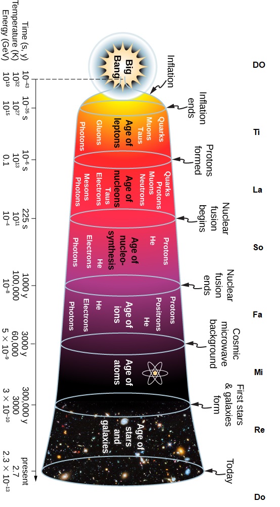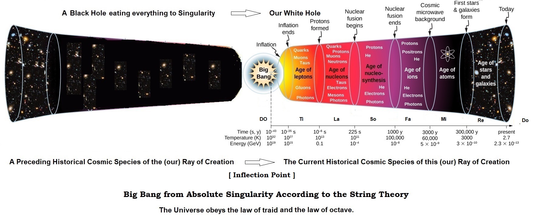 The Way of Particle Physics: The Stages of Particle Development of Matter as a Historical Octave DO - Big Bang (10-43 - 10-35 seconds) TI - Age of Leptons (10-35 - 10-6 seconds) LA - Age of Nucleons (10-6 - 225 seconds) SO - Age of Nucleo-Synthesis (225 seconds - 1,000 years) FA - Age of Ions (1,000 years - 3,000 years) MI - Age of Atoms (3,000 years - 300,000 years) RE - Age of Stars and Galaxies (300,000 years - Present) DO - The present universe as it is from a phenomenal (non-noumenal) approach! Note that 'Big Bang' (DO) and its octave is a major physical octave of 'The Absolute Above' (DO) as it octavizes into the Ray of Creation. The former is pure physical while the latter is functional/psychical but the two octaves are of ONE, that is, integrated into ONE! The 'Black Holes' of the 'Absolute Below' assist to return material of highest fineness and 'spirituality' back to the Absolute Above for cosmic occasional replenishment, nourishment, maintenance and repair.