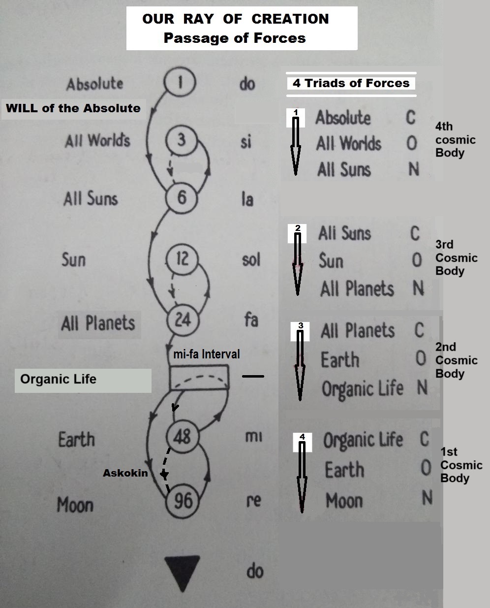 possible mineral “life” at the MI-FA Interval of the (our) Ray of Creation. 4. These being psyche hydrogens permeate all the Rays of Creation including the ABSOLUTE ABOVE. They are “housed” in the cosmoses from the Protocosmos (World 1 hydrogens), the Ayocosmos (World 3 hydrogens), the Macrocosmos (World 6 hydrogens), the Deuterocosmos (World 12 hydrogens), the Mesocosmos (World 24 hydrogens), the Tritocosmos (World 48 hydrogens and World 96 hydrogens) where man is a three-brained highest Microcosm) and the other Organic Life (World 96 hydrogens) and finally to the Mysterious Eight near the Absolute Below or the Black Holes on transit to the Absolute Above. 5. The external physical structure or shape or boundaries or cosmic capsules are respectively called by physical observation, the ‘Absolute’ (shapeless), ‘All the Worlds from All the Clusters of Galaxies’, ‘A Galaxy or Group of Suns’, ‘The Sun, Solar System’, ‘The Earth, or any of the Planets’, ‘The Philosophical Earth, Human Being’ and ‘The Abyss, Hell’ which is in the MI-FA Interval of the (our) Ray of Creation. finally the physical Moon. 6. The resolution of such physical (Astronomical) and psyche (astrological) divide and obfuscation is best resolved by introducing the concept of the MI-FA Interval and the TI-DO Interval and a Linkpin "SO-LA Interal" where shocks are required at these intervals that need to be link-welded according to the law of three; the concept of the Law of the Four Body Mandate; and the psyche that is able to coat matter. 7. Then there would be a Mysterious Eight "Cosmos" (DO-cosmic stopinder) for the microcosmic molecules, atoms, particles and wave-particles or Particle-Wave-Psyche (PWP) quantum domain of microcosmoses. 8. The Mesocosmos and the Deuterocosmos exist between the Microcosm, Man, and the Macrocosm. Therefore, the phrase which states, “Man (the human being) is the Microcosm of the Macrocosm,” becomes a little capricious.