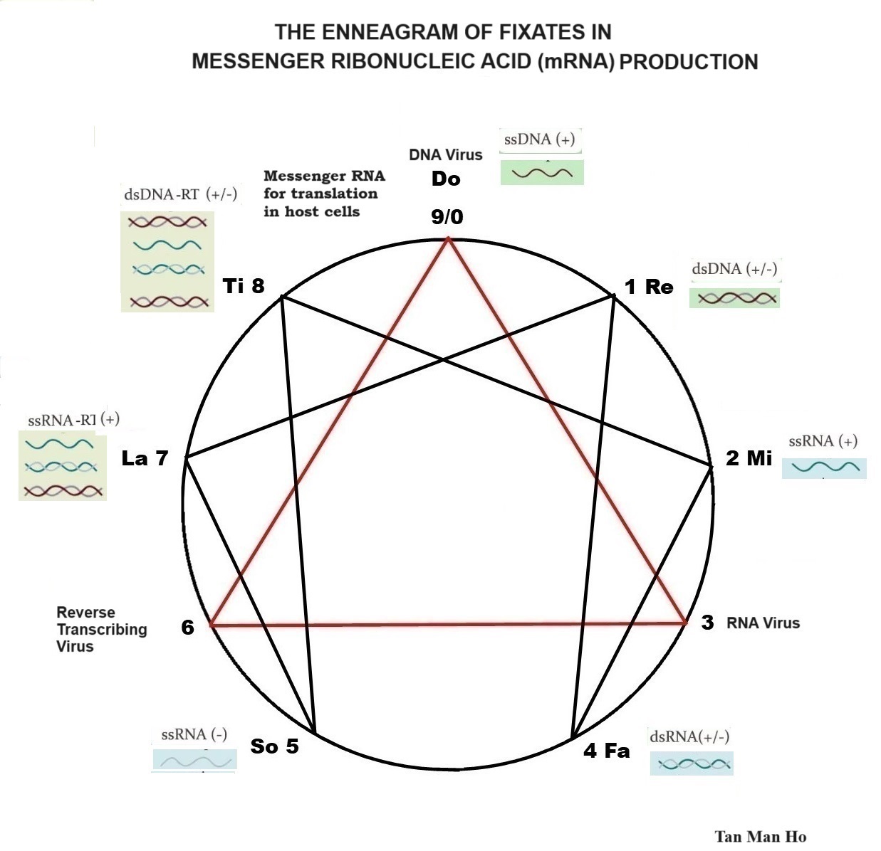 2 Some diagrams for visual discourses on the first 3 notes in the Historical Microbiocosmic Octave – the archaeal viruses, the bacterial viruses and the eukaryotic viruses (independent organism or dependent cells of higher organism). Viruses contain either DNA or RNA as their nucleic acids, and some other protein molecules for their outer membranes. The enneagram of fixates in mRNA production An enneagram of the messenger Ribonuclei Acid (mRNA) is possible but deserves further observation. We have no real control of the smallest biocosmic units that constitute all Organic Life discovered in the MI-FA Interval of the (our) Ray of Creation. Our noomakhian logos could hurried us into such a meddling of the smallest unit of uncertain chemical or biological nodal line for outwitting real and/or invented capitalistic-essenced competitors and/or enemies, but man's outsmarting of nature can also be outsmarted by nature. Description: Input Point '0': It is the first fixated (Do) of a single-stranded DNA positive sense [ssDNA(+)] from a virocosmic stopinder of a typical DNA virus to enter into the enneagram of the mRNA of production fixates as the basic unit for the enneagram cycle, and at the same time in a triad of three inputs, namely: Input Point '0/9', Input Point 3 and Input Point 6. 1 Re: It is a second fixate (Re) of a double-stranded DNA positive/negative sense or ambisense [dsDNA(+/-)] to stopinderate in the enneagram of the mRNA of fixates. 2 Mi: It is a third fixate (Mi) of a single-stranded RNA positive sense [ssRNA(+)] to stopinderate in this same mRNA enneagram of the mRNA fixates. Input Point 3: It is the 1st input at the Mi-Fa Interval after the original starter Input Point '0'which consists of RNA viruses. 4 Fa: It is the fourth fixate (Fa) of a double-stranded RNA positive/negative sense or ambisense [dsRNA(+/-)] to stopinderate after the Mi-Fa Interval. 5 So: It is the fifth fixate (So) of a single-stranded RNA negative sense [ssRNA(-)] to stopinderate further. Input Point 6: Here is the 2nd input at the "So-La Interval" for the unique reverse transcribing virus of the three inputs at point '0', point 3 and point 6. 7 La: It is the sixth fixate (La) of a single-stranded RNA positive sense [ssRNA(+)] in a reverse transcribing process collective from ssRNA(+) to ssRNA(+)-ssRNA(-) to dsDNA(+/-). 8 Ti: It is the seventh fixate (Ti) of a double-stranded DNA positive/negative sense or ambisense [dsDNA(+/-)] in a further reverse transcribing process to complete the final double-stranded DNA positive/negative sense or ambisense [dsDNA(+/-)] to produce a new DNA virus which can enter as Input Point 9 for the next mRNA enneagramic cycle to produce more and more variants or polypeptides, to the terror of an uncontrollable situation. Input Point 9: The rising of a new variant DNA virus for the next possible enneagramic mRNA cycle, stopinderation happens with the right incumbent mRNA fixates or any other right RNA viruses.