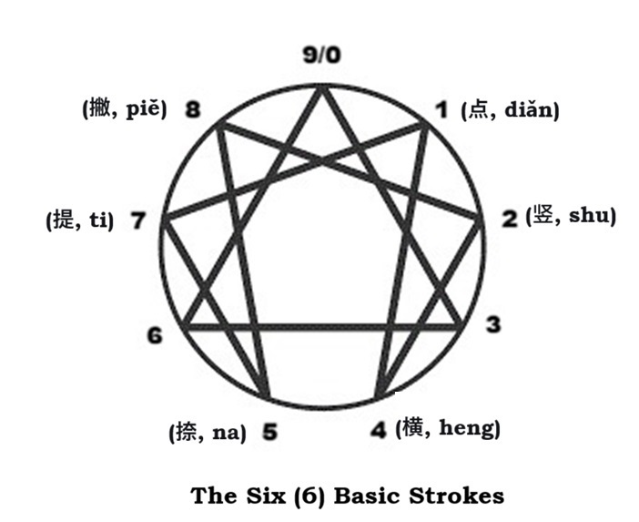 The six basic strokes are mapped to the inner **1-4-2-8-5-7** fixates of the enneagram, representing core processes: